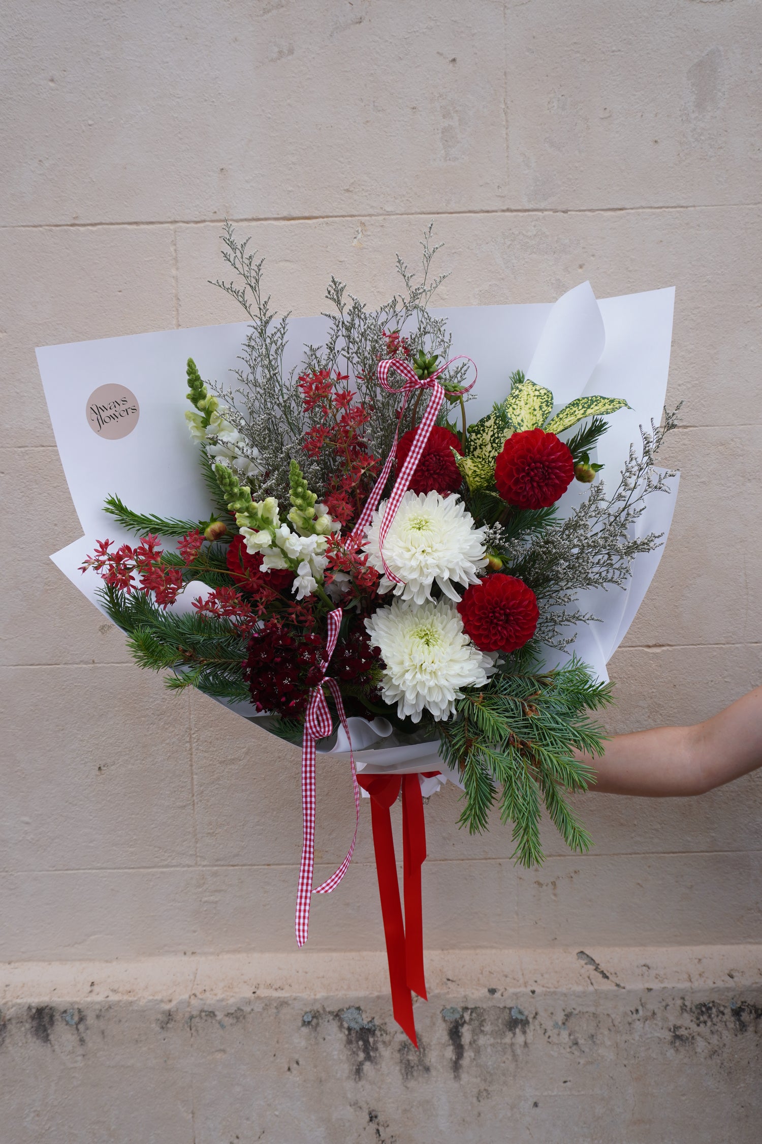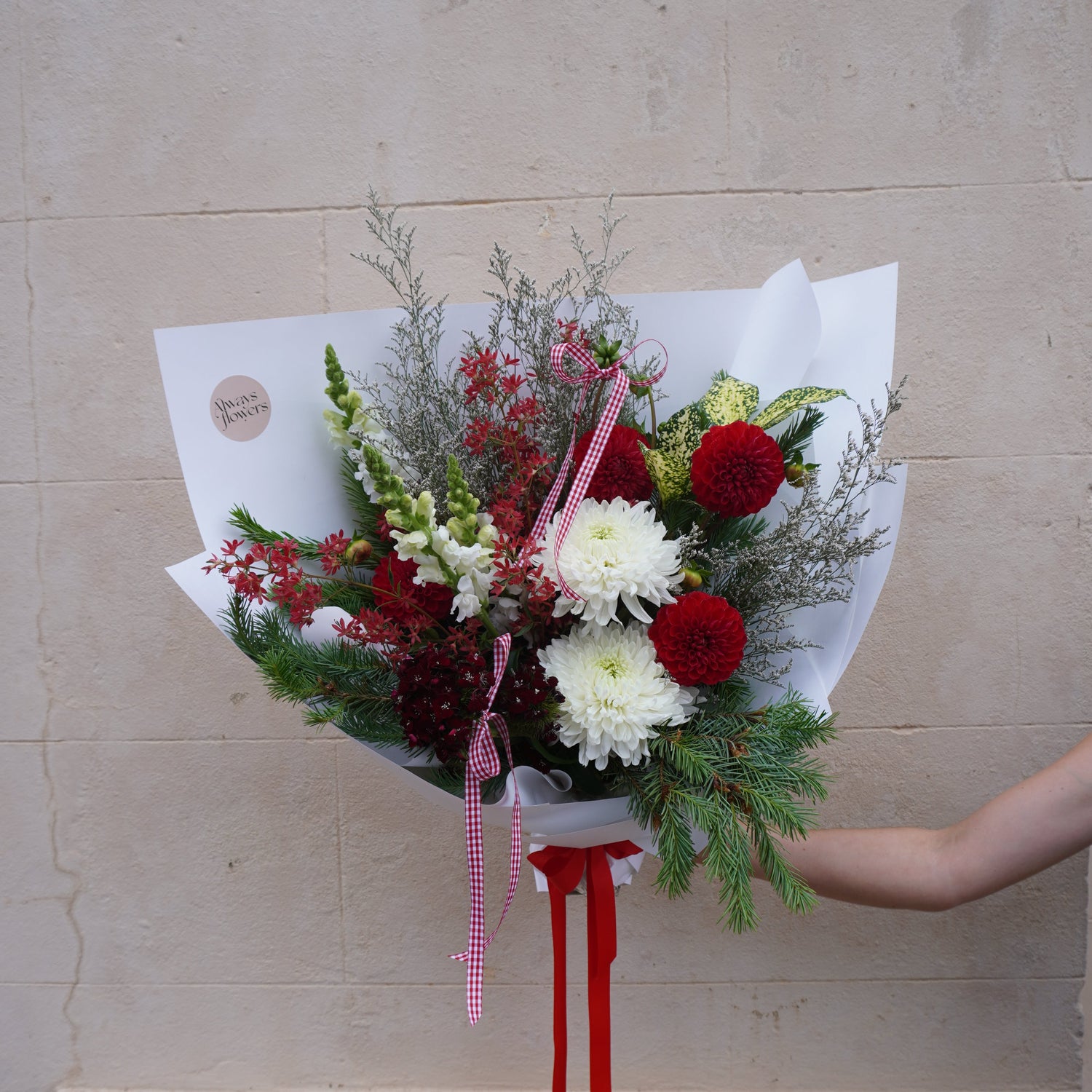 A fun & bold arrangement of seasonal white and cream-toned blooms with a pop of red. Each bouquet is a harmonious blend of texture and tone, handpicked to reflect the festivity of the season. Perfect for those who love a little Christmas spirit.
